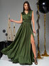 Платье длины миди без рукавов, с V-образным вырезом горловины. По ноге глубокий разрез.