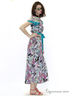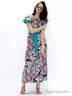 Длинное платье прямого силуэта, приталенное за счет контрастного пояса, вырез лодочкой, рукав короткий крылышко с воланом.