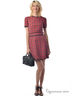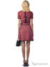 Платье укороченной длины, рукав короткий, отрезная талия, пояс, застежка сзади на пуговицу. Оригинальность модели придает разрез сзади изделия и крепление разреза на небольшие бантики.