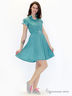 Платье с коротким рукавом, рубашечный воротник, застежка на пуговицы, отрезная талия, пояс, расклешенная юбка. Модель украшена контрастными канатами.