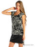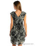Короткое комбинированное платье без рукавов с круглым вырезом горловины. На горловине платье украшено золотым клевантом.