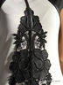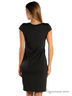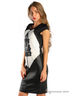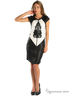 Комбинированное платье-футляр с рукавами в форме луны и круглым вырезом горловины. Платье украшено ажурным вышитым клевантом на контрастном фоне в области груди.