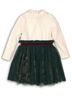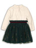 Платье приталенного кроя с длинным рукавом, круглым вырезом. На спине застежка на кнопки.