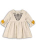 Платье с длинными рукавами и круглым вырезом горловины. Модель спереди дополнена принтом и бантиками на рукавах.