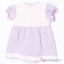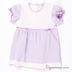 Детали: округлый вырез горловины, короткий рукав-фонарик, застежка на две пуговицы на спинке, отрезной лиф подчеркнут контрастной атласной лентой с тканевым цветочком