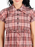 Детали: отложной ворот-стойка, застежка на четыре пуговицы на полочке, короткий рукав с кулиской, отрезной пояс с кулиской
