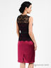 Великолепное платье-футляр из плотной атласной ткани. Округлый вырез горловины. Застежка на спине на пуговицу и на потайную молнию в боковом шве. Верхняя часть выполнена из тонкого, изящного кружева. Сзади подол дополнен шлицей. Платье декорировано эффектным атласным поясом и оригинальной брошью со стразой.