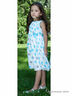 Горловина, пройма рукава и рельефные швы оторочены бирюзовым кантом в тон ткани, талия украшена двумя бантиками и регулируется вшивным поясом.