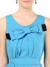 Детали: платье на широких лямках, круглый вырез горловины, с лицевой стороны изделие украшено декоративным бантом, у горловины с лицевой стороны и по спинке ткань плиссирована, шлевки под ремень, ремень из основного материала в комплекте, подол - волан из сетчатой ткани.