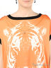 Детали: вырез горловины - лодочка посажен на трикотажную резинку, оригинальный принт с лицевой стороны в виде тигра, подол - широкая трикотажная резинка, по спине ткань - трикотаж, декоративная цепочка с кулоном украшенным стразами в комплекте.