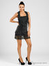 Оригинальное платье дизайнерского кроя подойдет для веселой вечеринки. Тонкая эластичная синтетическая ткань. Бретель через шею с многочисленными рюшами, с открытой спиной. В верх спинки продета поддерживающая резинка. Полочка дополнена оригинальной сборкой. Низ изделия декорирован многочисленными рюшами.