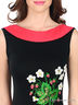 Детали: вырез горловины - лодочка с оригинальным отложным воротом, глубокий вырез по спинке, платье отрезное по линии талии, без рукавов, ручная роспись по трикотажу: рисунок - цветы, юбка - полусолнце.
