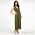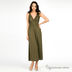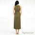 Длинное трикотажное платье из струящегося материала. Пояс посажен на многорядную резинку. Бретели оформлены деревянными бусинами.