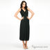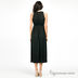 Длинное трикотажное платье из струящегося материала. Пояс посажен на многорядную резинку. Бретели оформлены деревянными бусинами.