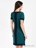 Элегантное платье приталенного силуэта выполнено из плотного неэластичного материала. Округлый вырез горловины, короткий рукав. Скрытая застежка на молнию на спинке. Контрастный вырез горловины украшен пришитой цепочкой. Втачной контрастный пояс декорирован тканевым бантом с подвеской. Отличный вариант для создания оригинального образа.