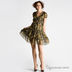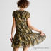 Очаровательное летнее платье из тонкой ткани-сетка. Линия талии завышена, вырез V-образный, декорирован рюшей. Под грудью выполнена завязка. Короткий рукав-фонарик. От линии бедра на юбке легкие воланы. Платье дополнено подъюбником.