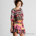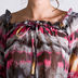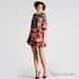 Очаровательное короткое летнее платье из тонкой креп-ткани. Линия талии присборена на резинку, манжеты рукавов эластичные на резинках. На юбке воланы. Вырез-лодочка присборен, декорирован завязкой.