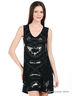 Детали: проймы и округлый вырез горловины дополнены трикотажными лентами, полочка декорирована пайетками и набивным рисунком