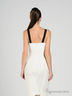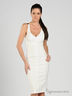 Приталенное белое платье из плотного, слегка эластичного материала. V-образный вырез. Бретельки на спине переходят в широкие резинки. Застегивается на молнию на спинке. Благодаря вытачкам платье идеально садится по фигуре.