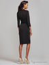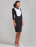 Эффектное приталенное платье. Округлый вырез горловины декорирован бантом. Укороченные рукава с манжетами. Отрезной пояс. Платье декорировано белой вставкой на груди с оборками и пуговицами.