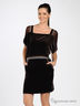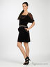 Вырез каре. Короткие цельнокройные рукава с манжетами. На плечах прозрачные вставки из шифона, украшенные защипами. Два втачных кармана. Застегивается на молнию в боковом шве. Украшено многослойными шифоновыми оборками с необработанными краями.