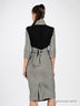 Воротник стойка. Рукава 3/4 с отворотами. На спинке вставка из прозрачного креп шифона в складку. Вшитый пояс завязывается сзади. Юбка карандаш.
