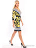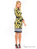 Короткое стрейчевое платье с рукавом длиной 3/4, V-образным вырезом горловины и отрезной линией талии; декорировано разноцветным фольклорным принтом.
