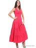 Расклешенное летнее платье из хлопчатобумажного фактурного материала. V-образный вырез с запахом, без рукавов, сзади застегивается на молнию.