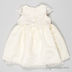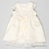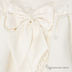 Яркое, нарядное платье из тонкого, нежного атласа с гипюровым кружевом, с застежкой на пуговицы на спине. Короткий рукав выполнен из гипюрового кружева, полочка декорирована бусинами под жемчуг. Отрезная юбка декорирована бантом и гипюровым кружевом.