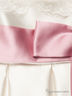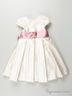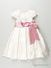 Нарядное платье выполнено из тонкой атласной ткани с батистовой подкладкой. Округлый вырез горловины декорирован гипюровым кружевом, застежка на молнию на спине, короткий рукав-крылышко, широкий атласный пояс с декоративным бантом продет в шлевки, пышный низ изделия дополнен шелковистой подкладкой с сетчатой оборкой.