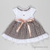 Нарядное платье с завышенной талией. Короткие рукава. Застежка на пуговицы. Изделие украшено лентой с декоративными цветами.