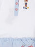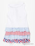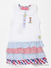 Замечательное платье с короткими рукавами и округлым вырезом горловины. Модель спереди дополнена частичной застежкой на пуговицы, а так же небольшой вышивкой. Юбка выполнена в виде рюш различных расцветок. Отличный вариант на каждый день.