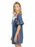 Платье для девочек из тонкой джинсы, модного А-образного силуэта, с укороченным рукавом с притачной рюшей.