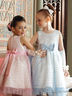 Прекрасное платье из ткани и сетки с узором в виде маленьких сердечек. Круглый вырез горловины. Застежка на спине на молнию. Отрезной пояс из широкой атласной ленты, украшенный бантами. Пышная юбка средней длины.