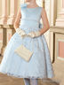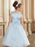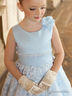 Изящное платье из гладкой ткани и тонкого кружева. Круглый вырез горловины. Полочка декорирована крупным текстильным цветком. Широкий отрезной пояс украшенный оборками. На спинке пришит ряд декоративных пуговиц. Многослойная юбка средней длины украшена крупным бантом на спинке.