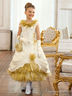 Потрясающее платье из плотной ткани. Округлый вырез горловины декорирован золотистой сеткой и лентами. По бокам шнуровка лентами. Юбка многослойная, украшенная оборками. Верхняя юбка оригинально задрапирована и украшена декоративным цветком из золотистой сетки.