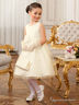 Изящное платье из гладкой ткани. Округлый вырез горловины. Отрезной лиф из рельефной ткани украшен крупным цветком. Пышная юбка средний длины декорирована пришитыми на сетчатую юбку цветами.