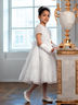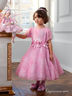 Стильное платье из тонкой ткани с подкладкой. Круглый вырез горловины. Рукава-фонарики. Пояс декорирован цветами из ткани и лентами. Длинная расклешенная юбка.