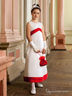 Элегантное церемониальное платье в стиле «ампир», выполнено из матового атласа. Лиф украшен декоративной драпировкой контрастного цвета с узором из сияющих жемчужин. Струящаяся юбка с ярким кантом по подолу. Оригинальный бант на спинке, переходящий в объёмный шлейф, завершает утончённый стиль модели.