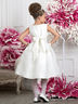 Праздничное платье для девочек младшего возраста. Модель без рукавов, классического кроя из атласного полотна цвета айвори, с завышенной линией талии и застежкой–молнией. Лиф с круглым вырезом по горловине, спереди украшен цветочной вышивкой и жемчужными бусинками. Юбка с верхним слоем из прозрачного фатина, декорирована в едином стиле с лифом. Подъюбник выполнен из плотной ткани и дополнен оборками из жесткой сетки - для создания пышности. Линия талии с широким атласным поясом, который завязывается в красивый пышный бант и обеспечивает идеальную посадку по фигуре.