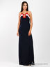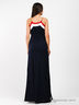 Детали: вырез капелька горловины, контрастные вставки, эффектные бретели-золотистые пластмассовые цепи, струящаяся расклешенная юбка.