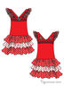 Великолепное пляжное платье из качественного материала. Широкий V-образный вырез горловины декорирован многорядными воздушными оборками. Полочка декорирована стильным цветком. Отрезная пышная юбка с многорядными оборками.