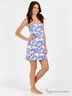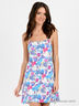 Оригинальное пляжное платье из тонкого эластичного материала. Верх изделия посажен на резинку, спереди дополнен кулиской с эластичной лентой, которая завязывается через шею. Декорировано оригинальным принтом.