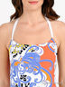 Оригинальное пляжное платье из тонкого эластичного материала. Верх изделия посажен на резинку, спереди дополнен кулиской с эластичной лентой, которая завязывается через шею. Декорировано оригинальным принтом.