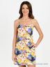 Оригинальное пляжное платье из тонкого эластичного материала. Верх изделия посажен на резинку, спереди дополнен кулиской с эластичной лентой, которая завязывается через шею. Декорировано оригинальным принтом.