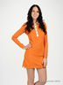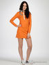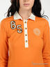 Трикотажное платье-поло прямого покроя. Отложной воротник и планка-застежка из легкого денима. Длинные рукава. На полочке нашивки.