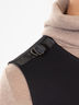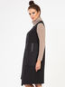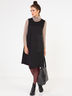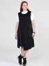 Платье трапециевидного силуэта, без рукава. Горловина круглая. Перед с кокеткой и отлетной деталью, с большим накладным карманом-книжкой с клапаном.. На правое плечо переда и посередине клапана настрочена репсовая лента шириной 2,5см с двумя полукольцами.Нижняя средняя часть переда, карман и клапан выполнены из хлопка в тон основного сырья. Цвет черный.