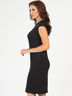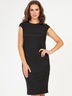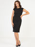 Платье полуприлегающего силуэта.Спинка со средним швом, перед с нагрудными вытачками. Горловина круглая, плечо спущенное. Черный трикотаж.