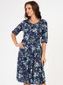 Платье отрезное по линии талии. Рукав реглан,3/4, по низу на эластичной тесьме. Горловина переда и спинки собрана в сборку. Юбка полусолнце. По шву талии эластичная тесьма.