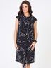 Платье прямого силуэта, со спущенным плечом. Перед со средним швом, с поперечными рельефными швами, с карманами. По среднему шву переда настрочен волан. Воротник - стойка.